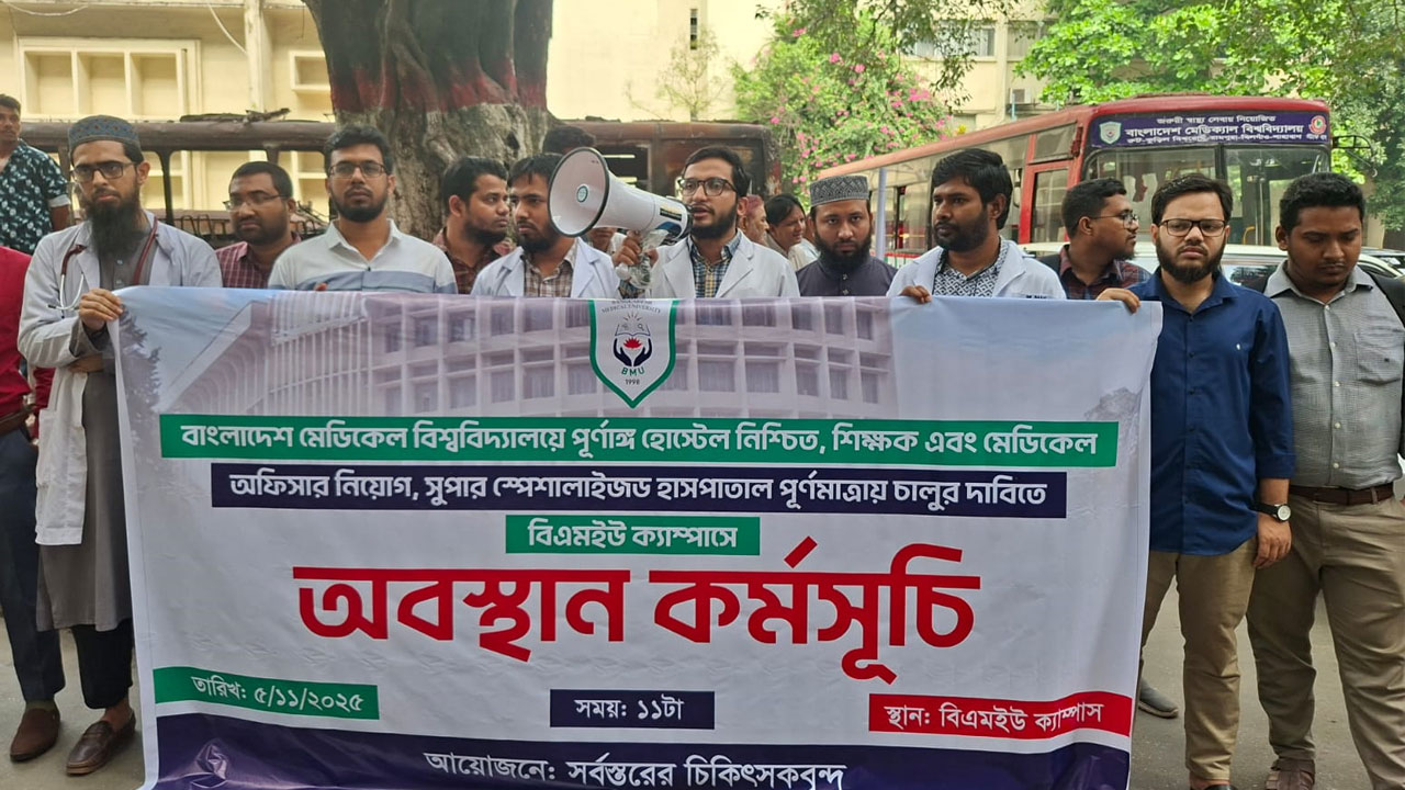 মানববন্ধনে চিকিৎসকরা আরও অভিযোগ করেন, বিশ্ববিদ্যালয়ের শত শত রেসিডেন্ট চিকিৎসককে রাজধানীর বিভিন্ন জায়গায় কষ্ট করে থাকতে হয়। তাদের জন্য নির্দিষ্ট কোনো হোস্টেল নেই, ফলে সময় মতো ডিউটিতে পৌঁছানো ও রাতের জরুরি সেবা দেওয়া কঠিন হয়ে পড়ে।