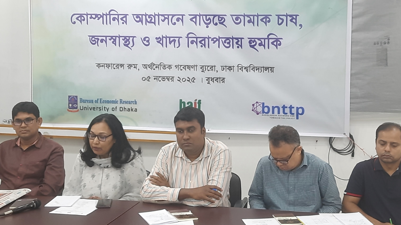 মঙ্গলবার (৫ নভেম্বর) ঢাকা বিশ্ববিদ্যালয়ে অর্থনৈতিক গবেষণা ব্যুরো (বিইআর) এবং বাংলাদেশ নেটওয়ার্ক ফর টোব্যাকো ট্যাক্স পলিসি (বিএনটিটিপি) আয়োজিত ‘কোম্পানির আগ্রাসনে বাড়ছে তামাক চাষ, জনস্বাস্থ্য ও খাদ্য নিরাপত্তায় হুমকি’ শীর্ষক সভায় বক্তারা এসব কথা বলেন৷