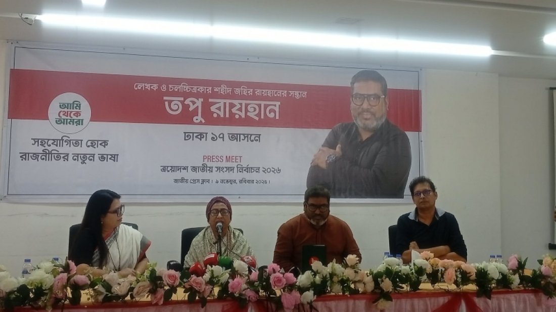 রবিবার জাতীয় (৯ নভেম্বর) দুপুরে জাতীয় প্রেসক্লাবের আব্দুস সালাম মিলনায়তনে ঢাকা-১৭ আসনে জহির রায়হান ও সুচন্দা দম্পতির ছোট ছেলে তপু রায়হানের প্রার্থিতা ঘোষণা অনুষ্ঠানে এসব কথা বলেন তিনি।