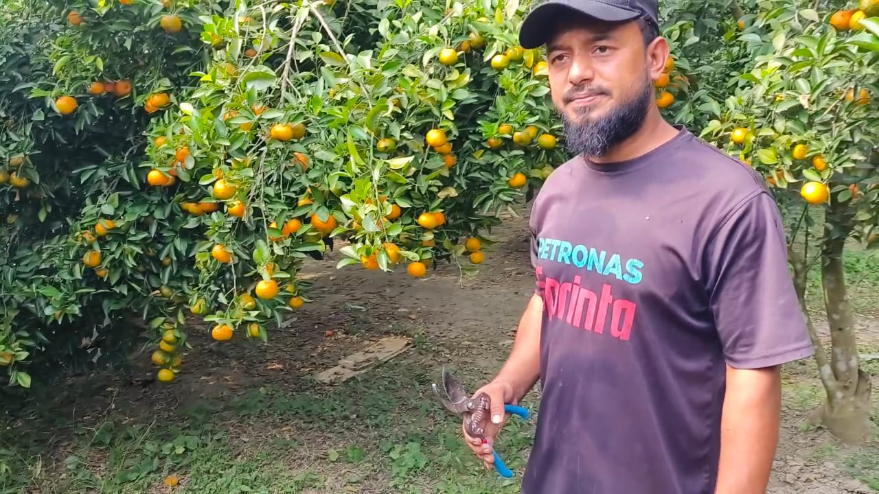 রাসেলের নয় বিঘার জমির দেড় বিঘা জুড়ে রয়েছে তার স্বপ্নের কমলা বাগান। প্রায় ছয় বছর আগে লাগানো চাইনিজ জাতের ছোট আকারের কমলা গাছে গত দুই বছর ধরে টানা ভালো ফলন দেখা যাচ্ছে। বাগানে ঢুকলেই চোখে পড়ে থোকায় থোকায় ঝুলে থাকা সোনালি কমলা। শুধু সৌন্দর্যই নয়—এই ফলন রাসেলের জীবনে এনে দিয়েছে সাফল্যের নতুন অধ্যায়।