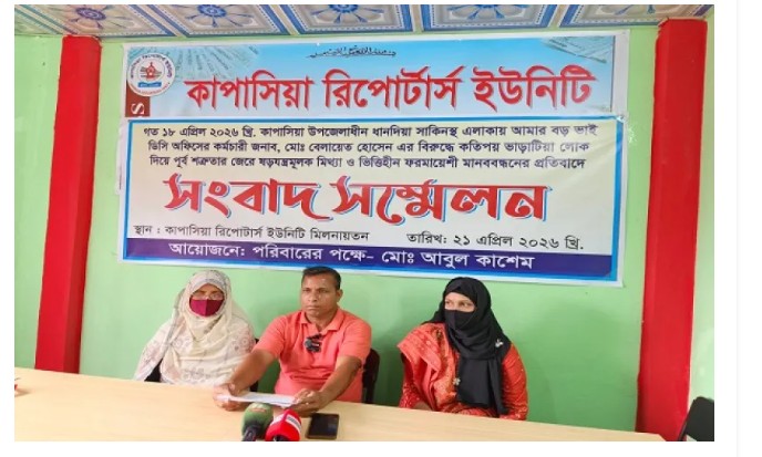 জানা যায়, কাপাসিয়া উপজেলার ধানদিয়া এলাকায় সোনাপুর মৌজার আর এস ৭০,৭১,৭২ ও ৭৪ খতিয়ানে মালিক আব্দুল হাই খাঁ এর এর পুত্র কাজল মিয়া নিকট থেকে বিগত ১৩ নভেম্বর ২০২৫ সালে ৪৬৫ শতাংশ জমির কাতে ১৪ শতাংশ জমি সাব কাওলা দলিল মুলে খরিদ করেন বেলায়েত হোসেন ও তার ছোট ভাই আবুল কাশেম। পরে নিজ নিজ নামে নামজারী করিয়া চাষাবাদ করে ভোগদখল করে আসছেন বেলায়েত হোসেন ও তার ভাই। এ জমি নিয়ে স্থানীয় আঁখি আক্তার নামে এক নারী জমির ওয়ারিশ দাবী করে আসছেন। এ নিয়ে দুই পক্ষের মধ্যে বিরোধ চলছে বেশ কিছু দিন যাবত। গত ১৮ এপ্রিল ওই নারীর উদ্যোগে ডিসি অফিসের কর্মচারী বেলায়েত হোসেনের বিরুদ্ধে মানববন্ধন করে সংবাদ প্রচার করা হয়। এর প্রতিবাদে আজ ২১ এপ্রিল বেলায়েত হোসেনের ছোট ভাই আবুল কাশেম পরিবারের পক্ষ থেকে কাপাসিয়া রিপোর্টার্স ইউনিটি কার্যালয়ে এক সংবাদ সম্মেলন করেন। আবুল কাশেম তার লিখিত বক্তব্যে বলেন, আঁখি আক্তার তিনি অহেতুক দাবী নিয়ে আমাকে ও আমার ভাই বেলায়েত হোসেনকে হয়রানির করছেন। যার কোনো ভিত্তি নাই। যেহেতু ওই নারী আদালতে দারস্থ হয়েছেন। আদালতে যে রায় হবে তা আমারা মেনে নেব কিন্ত আঁখি আক্তার আদালতকে অবজ্ঞা করে আমাদের বিরুদ্ধে মিথ্যা ও ষড়যন্ত্র মুলক মানববন্ধন করে সংবাদ প্রচার করেছেন। আমি এর তীব্র নিন্দা ও প্রতিবাদ জানাচ্ছি। তিনি আরও বলেন, স্থানীয় কতিপয় একটি স্বার্থান্বেষী মহলের যোগসাজশে ওই নারী আমাদের বিরুদ্ধে মিথ্যা মামলা করে হয়রানি করছেন। সাংবাদিকরা যেন সঠিক তথ্য উদঘাটন করে এবং তা প্রচারের মাধ্যমে দেশ ও জাতি জানতে পারে এমনটি দাবী করেন তিনি।