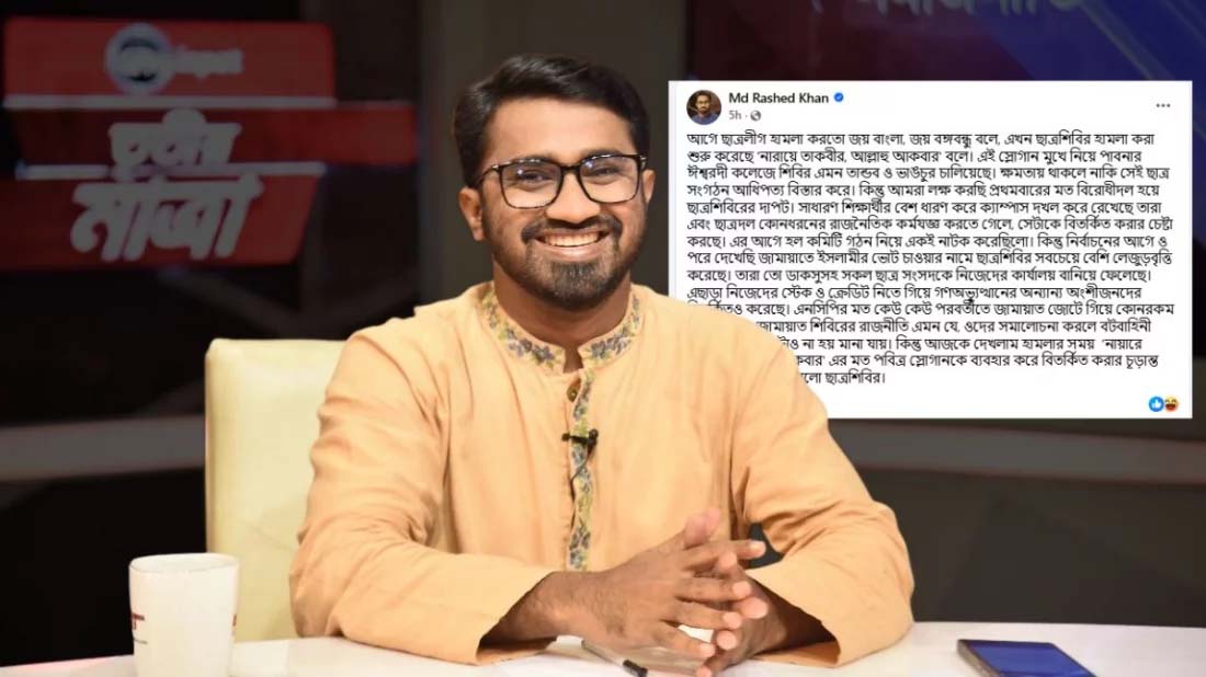 প্রভাত রিপোর্ট: ছাত্রলীগ ‘জয় বাংলা’ বলে হামলা করত, শিবির ‘নারায়ে তাকবির’ বলে হামলা করে- বলে অভিযোগ করেছেন গণঅধিকার পরিষদের সাবেক সাধারণ সম্পাদক ও বর্তমান বিএনপি নেতা রাশেদ খান। বৃহস্পতিবার (২৩ এপ্রিল) নিজের ভেরিফায়েড ফেসবুক পেজে দেওয়া এক পোস্টে এ কথা লেখেন তিনি।