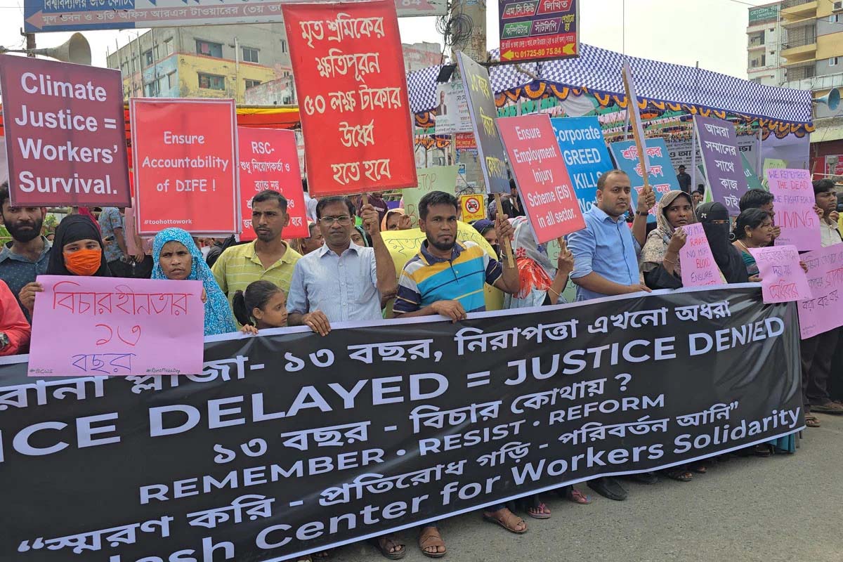 রানা প্লাজা ট্র্যাজেডির ১৩ বছর পূর্তি উপলক্ষে বিভিন্ন শ্রমিক সংগঠনের উদ্যোগে নানামুখী কর্মসূচি পালন করা হচ্ছে। কর্মসূচির মধ্যে রয়েছে রানা প্লাজার সামনে অস্থায়ীভাবে নির্মিত শহিদ বেদিতে সাভার-আশুলিয়ার-ধামরাইসহ বিভিন্ন শ্রমিক সংগঠনের নেতাকর্মীরা ও নিহত শ্রমিকদের আত্মীয় স্বজন সকাল ৯টা হতে দিনব্যাপী ফুল দিয়ে শ্রদ্ধা নিবেদন, মিছিল, মানববন্ধনসহ বিভিন্ন অনুষ্ঠান পালন করছে সংগঠনগুলো।