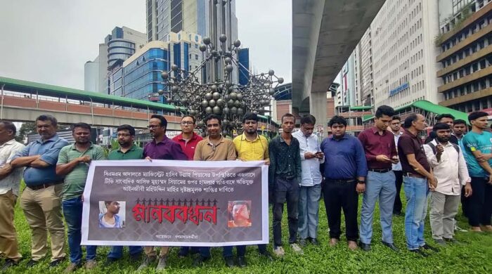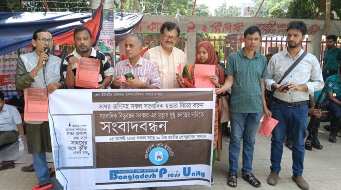 প্রভাত রিপোর্ট: সাংবাদিকদের রুটি-রুজী-জীবনের নিরাপত্তা ও বিভুরঞ্জনের মৃত্যুর সুষ্ঠু তদন্ত এবং সাগর-রুণিসহ সকল সাংবাদিক হত্যার বিচারের দাবিতে সংবাদবন্ধন অনুষ্ঠিত হয়েছে। ২৫ আগস্ট বেলা ১১ টায় জাতীয় প্রেসক্লাবের সামনে বাংলাদেশ প্রেস